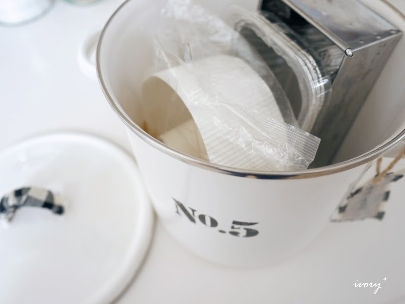 セリアの転写シールを付けたホーロー缶はお菓子の型入れに*