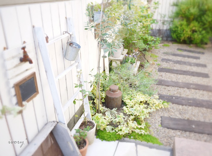 板壁の前は、雪柳やモッコウバラ、オリーブ、ラベンダー