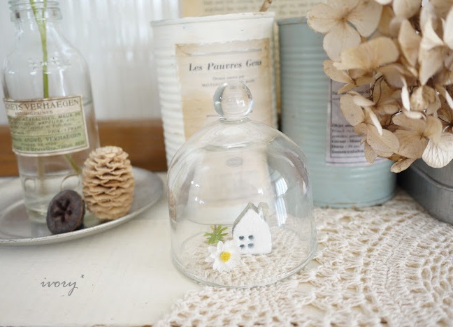 セリアのガラスドームに、白いおうちと花かんざしのドライを入れました(*´︶`*)