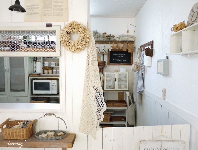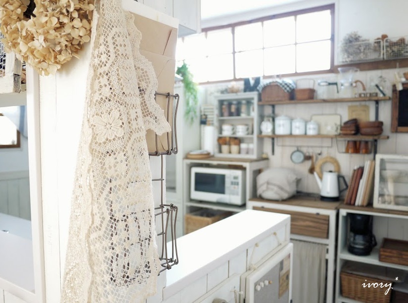 キッチンの入り口にレースを掛けました*